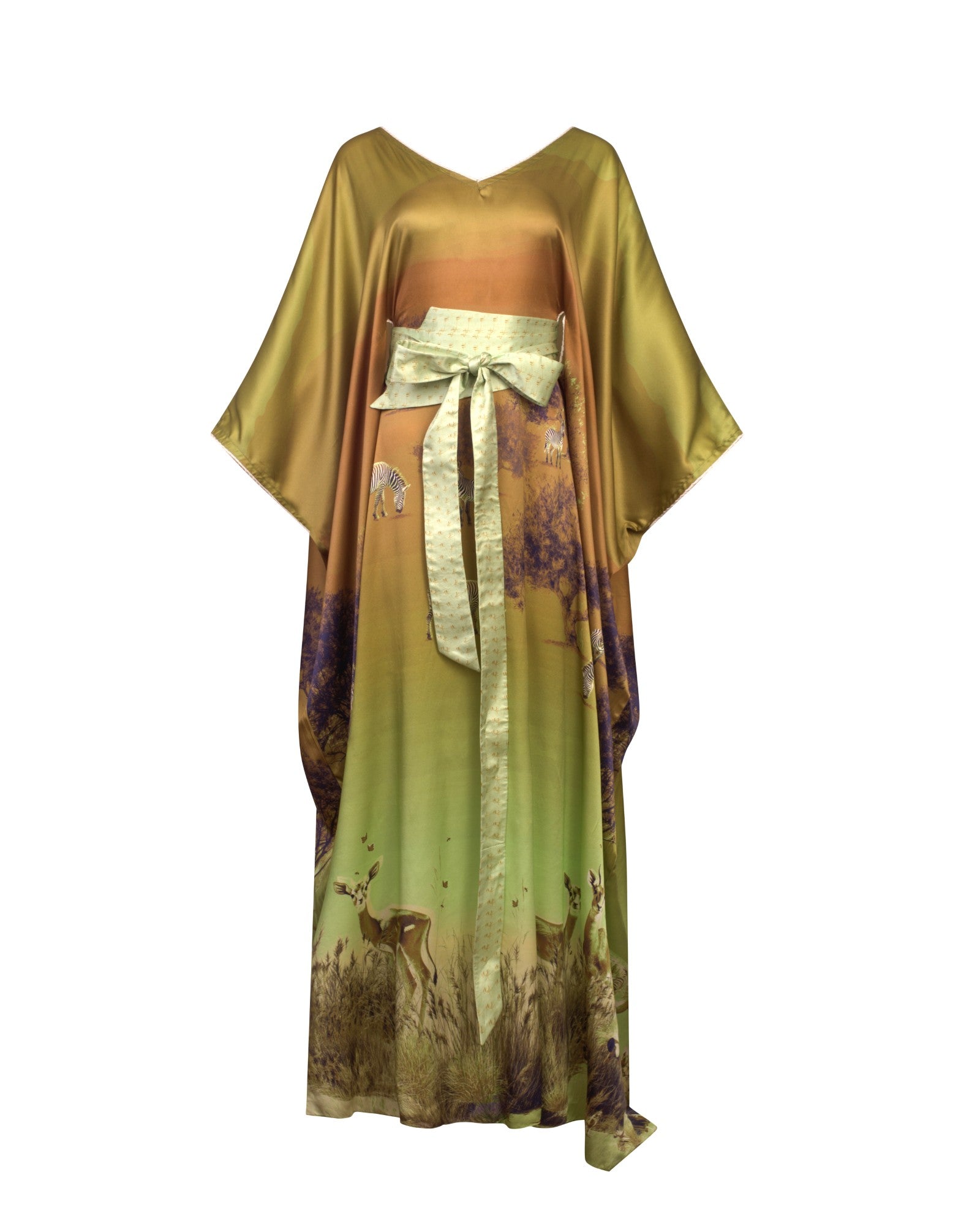 Forest Green Brown Savannah Scene V Neck Piped Silk Kaftan with Belt